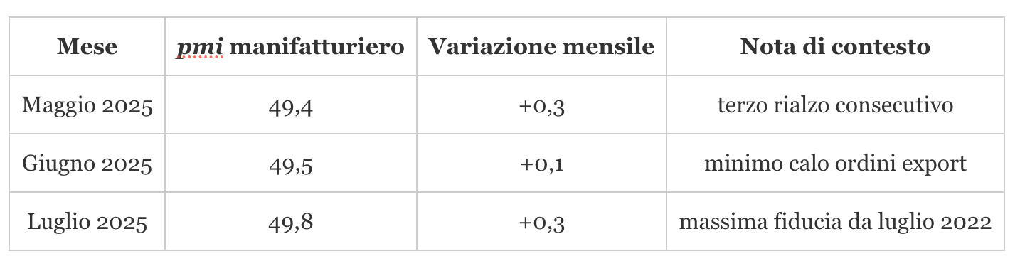 L’incremento si accompagna a due segnali rilevanti: la frenata del calo dei nuovi ordini e un ulteriore allentamento delle pressioni sui costi d’acquisto. In altre parole, la morsa “domanda debole + inflazione input (aumento dei costi)” che ha messo sotto stress i margini delle pmi manifatturiere nel 2024 sta via via perdendo forza.