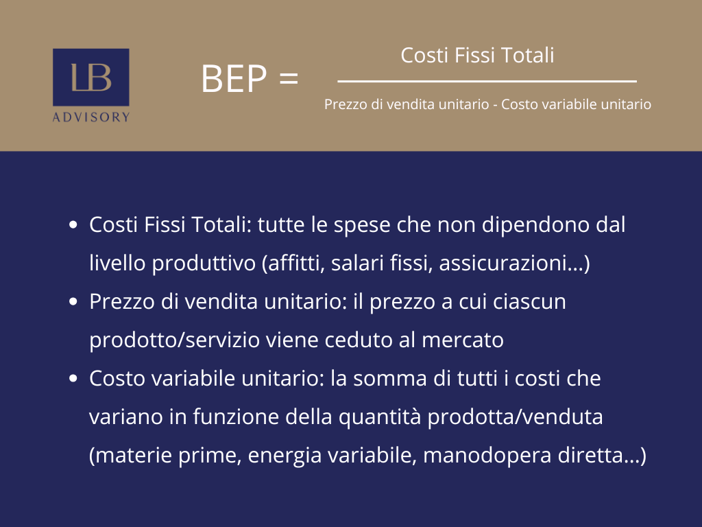 Il Break Even Point (BEP) si basa su una relazione matematica che mette a confronto costi fissi, costi variabili e ricavi associati alla produzione (o vendita) di beni o servizi. Nella versione base e più diffusa, la formula è: