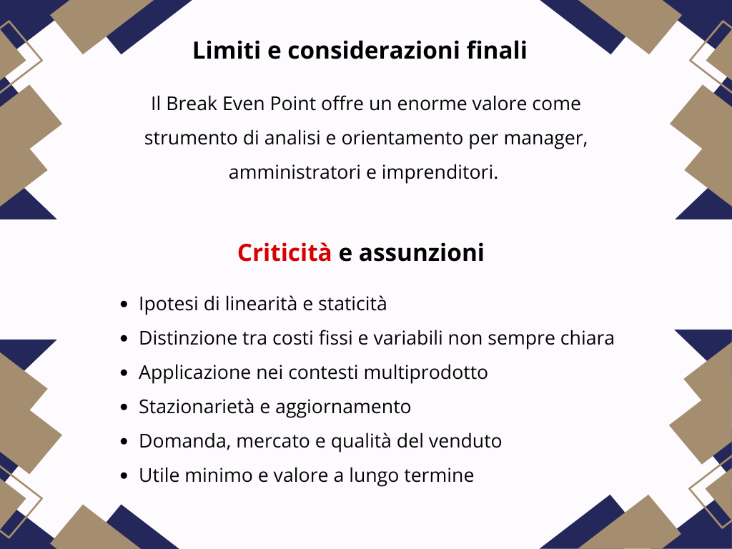 Il Break Even Point offre un enorme valore come strumento di analisi e orientamento per manager, amministratori e imprenditori. Tuttavia, come tutte le metriche, presenta dei limiti: solo conoscendoli è possibile trarne effettivo beneficio e utilizzarlo in modo intelligente, senza affidare l’intera strategia a un parametro che, per natura, ha difetti e deve essere interpretato. In questa sezione vengono illustrati i principali limiti, le assunzioni di fondo, alcune criticità tipiche e le migliori pratiche per integrare il BEP nei processi decisionali.