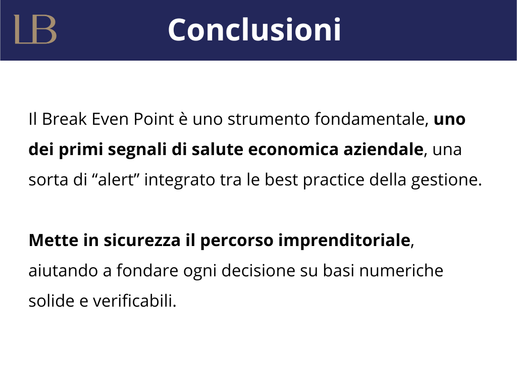 Per concludere il nostro excursus sul Break Even Point possiamo affermare senza ombra di dubbio che questo è uno strumento fondamentale, uno dei primi segnali di salute economica aziendale, una sorta di “alert” integrato tra le best practice della gestione. Sapere come calcolarlo, aggiornarlo e soprattutto conoscerne limiti e criticità, permette di gestire con maggiore lucidità start-up, sviluppo, crisi e crescita.
