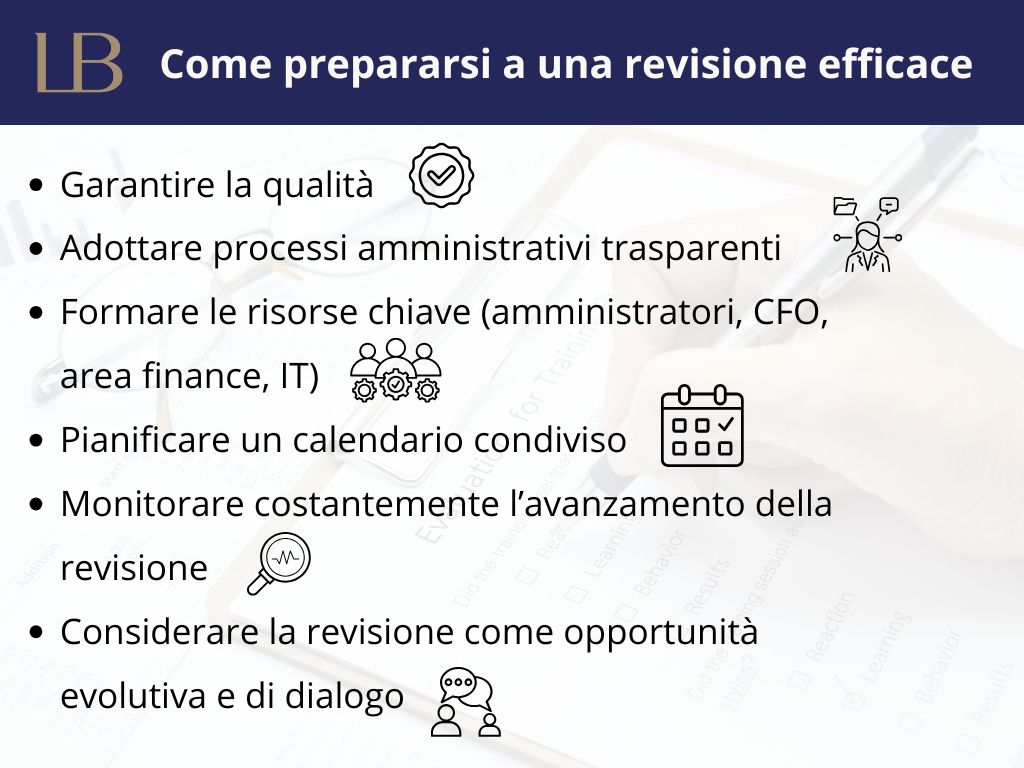 • Formare le risorse chiave (amministratori, CFO, area finance, IT) su logiche e finalità della revisione, prevenendo atteggiamenti reticenti o passivi che dilatano tempi e costi.