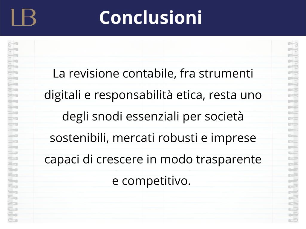 In conclusione, la revisione contabile, fra strumenti digitali e responsabilità etica, resta uno degli snodi essenziali per società sostenibili, mercati robusti e imprese capaci di crescere in modo trasparente e competitivo.