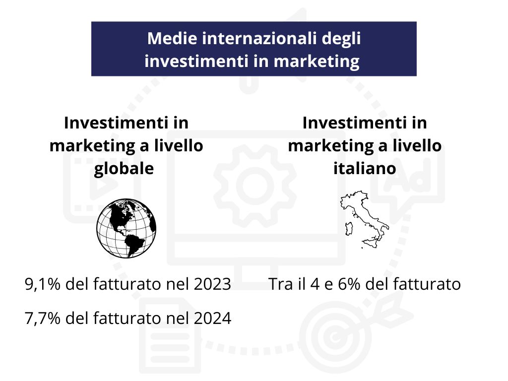 In Italia non abbiamo dati precisi e isolati dalle medie continentali, rispetto agli investimenti in marketing in rapporto al fatturato. È tuttavia appurato, fra chi opera nel settore, che le percentuali sono sicuramente inferiori rispetto ai mercati nordamericani ed europeo, per cui si stima che per un’azienda italiana investire in marketing un valore tra il 4% e 6% del fatturato, possa con molta probabilità portare a un tasso di crescita costante.