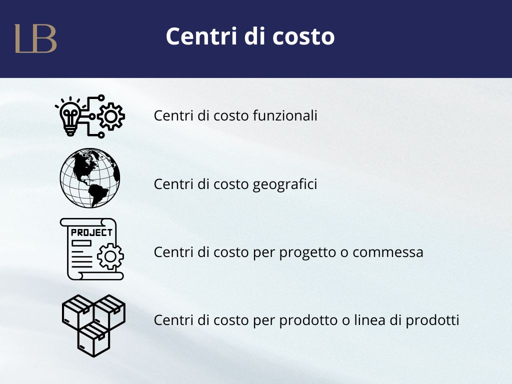 Le principali tipologie di centri di costo sono i centri di costo funzionali, geografici e per progetto o commessa.