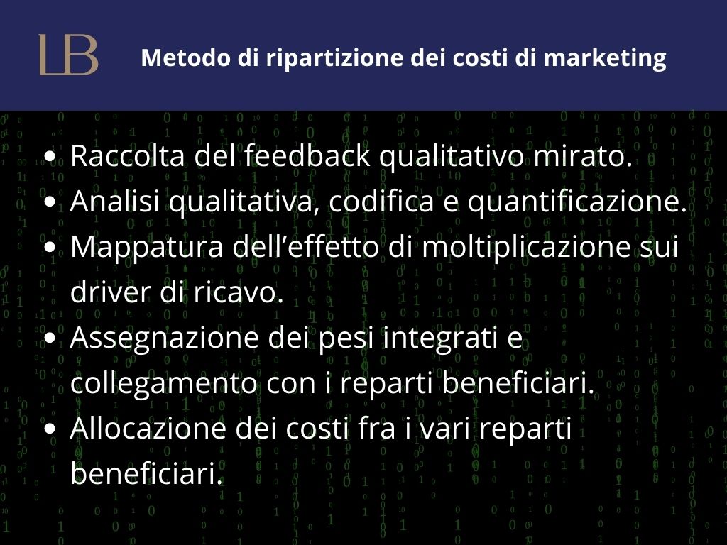 Questo processo è particolarmente rilevante per le attività di marketing, le cui spese dovrebbero essere allocate non solo ai reparti direttamente coinvolti, ma anche a quelli che beneficiano indirettamente delle iniziative di marketing.