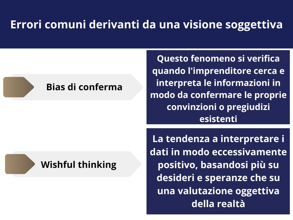 Uno degli errori più comuni legati a una visione troppo soggettiva è il bias di conferma. Questo fenomeno si verifica quando l'imprenditore cerca e interpreta le informazioni in modo da confermare le proprie convinzioni o pregiudizi esistenti. Ad esempio, se un imprenditore è fortemente convinto del successo di una nuova linea di prodotti, potrebbe ignorare o minimizzare i segnali di avvertimento provenienti dal mercato che indicano una domanda inferiore alle aspettative. Questo può portare a stime di budget troppo ottimistiche e, di conseguenza, a sovrainvestimenti in progetti che non generano il ritorno previsto.