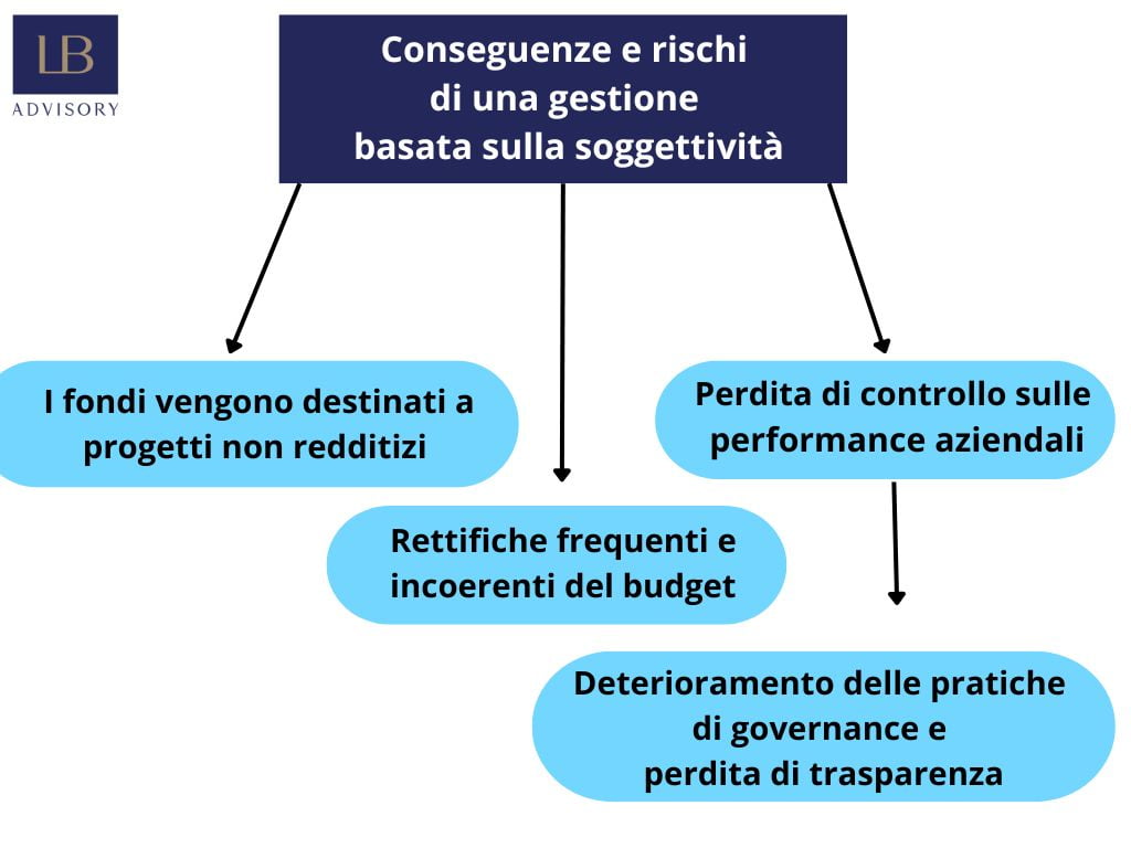 Inoltre, una gestione soggettiva può portare a rettifiche frequenti e incoerenti del budget. Questo crea un ambiente di incertezza all'interno dell'azienda, dove le previsioni finanziarie diventano poco affidabili e le decisioni strategiche sono costantemente riviste, spesso in modo caotico. Tale instabilità può ridurre la fiducia degli investitori, dei dipendenti e degli altri stakeholder, danneggiando la reputazione dell'azienda e limitando la sua capacità di attrarre capitali e talenti.