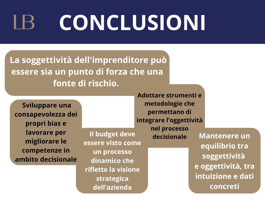 In un contesto economico sempre più incerto e dinamico, la capacità di un'azienda di adattarsi ai cambiamenti, pur mantenendo una solida base di controllo finanziario, può rappresentare la differenza tra successo e fallimento. Riconoscere e gestire la soggettività nelle decisioni di budget è un passo fondamentale in questa direzione. È importante che gli imprenditori sviluppino una consapevolezza dei propri bias e lavorino costantemente per migliorare le proprie competenze in ambito decisionale, utilizzando tutte le risorse disponibili per garantire che le loro scelte siano ben fondate e orientate al futuro.