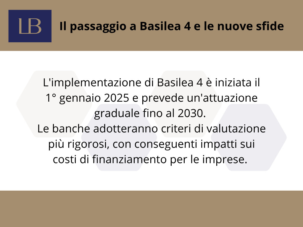 L'implementazione di Basilea 4 è iniziata il 1° gennaio 2025 e prevede un'attuazione graduale fino al 2030. Questo comporta che le banche adottino criteri di valutazione più rigorosi, con conseguenti impatti sui costi di finanziamento per le imprese.