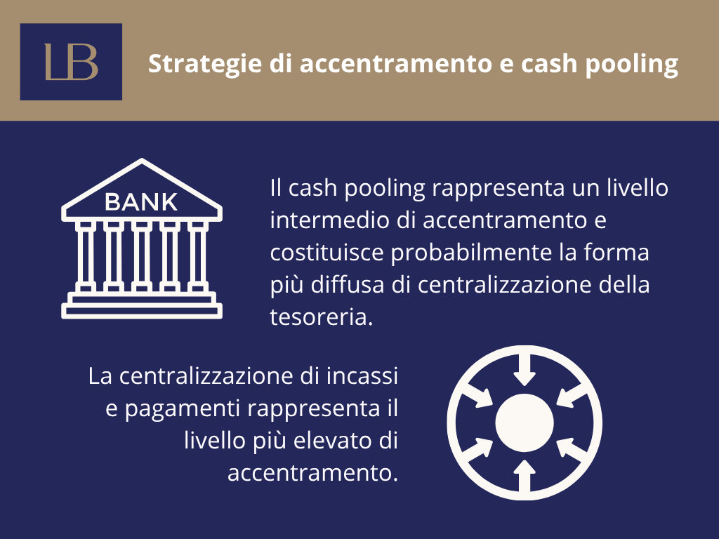 Il cash pooling rappresenta un livello intermedio di accentramento e costituisce probabilmente la forma più diffusa di centralizzazione della tesoreria. Si tratta di un accordo con una controparte bancaria per la gestione accentrata dei flussi finanziari, in base al quale le società appartenenti a un gruppo trasferiscono periodicamente i saldi dei rispettivi conti correnti a un conto master intestato all'unità centrale.