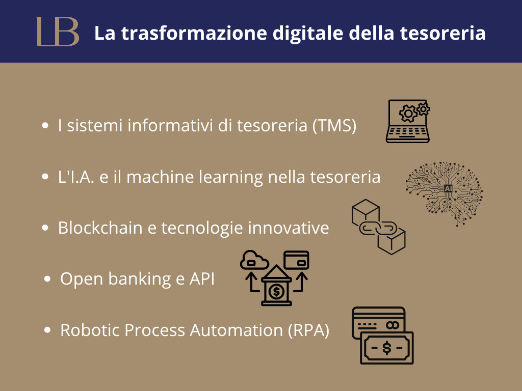 La trasformazione digitale ha rivoluzionato la gestione della tesoreria aziendale, trasformandola da funzione prevalentemente manuale a sistema integrato e automatizzato. La tesoreria diventa così un vero e proprio "info-server" per l'intera organizzazione, integrando informazioni interne ed esterne.