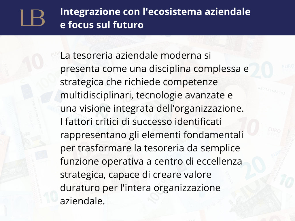 Il successo della tesoreria moderna dipende sempre più dalla sua capacità di integrarsi efficacemente con l'ecosistema aziendale complessivo. La tesoreria non può più operare in isolamento, ma deve diventare parte integrante del sistema di pianificazione e controllo aziendale.
