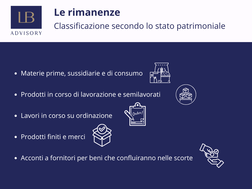 Lo schema di stato patrimoniale colloca le rimanenze nella sezione C.I dell’attivo circolante. Le sottovoci sono cinque e riflettono i diversi stadi della catena del valore: