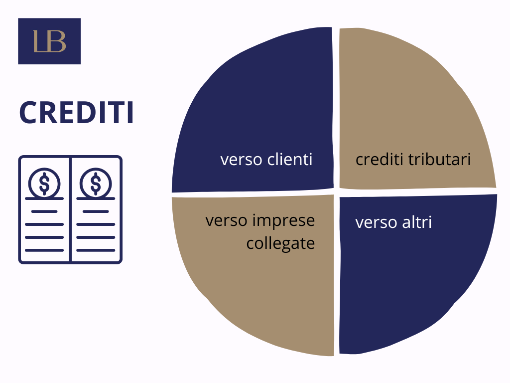 Lo schema civilistico inserisce i crediti nella sezione C.II dell’attivo circolante, articolandoli in sottovoci che riflettono la natura del rapporto: