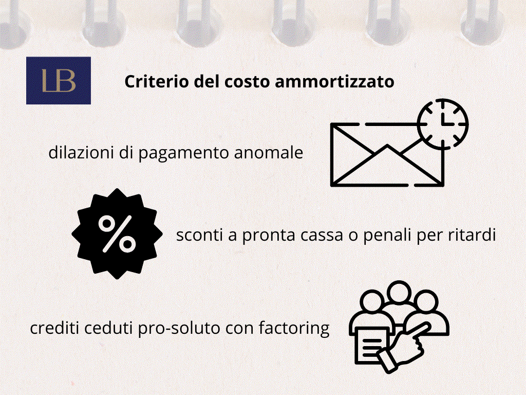 Dal 2016 crediti e debiti devono essere rilevati secondo il costo ammortizzato, metodo che attualizza i flussi finanziari futuri con il tasso d’interesse effettivo. Nella pratica, le transazioni commerciali ordinarie non prevedono in genere costi di transazione significativi né differenze tra valore nominale e valore di rimborso; di conseguenza l’effetto del costo ammortizzato è spesso irrilevante. Tuttavia, la disciplina diventa rilevante in presenza di: