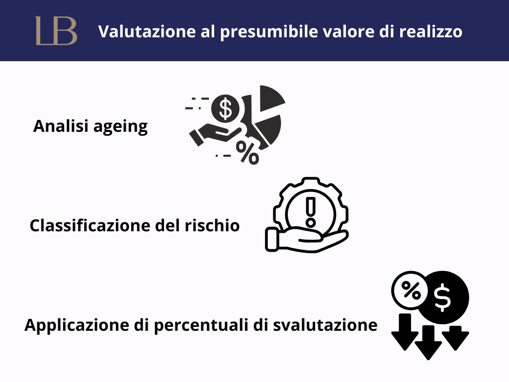 Il principio di prudenza impone di riportare i crediti al valore che si ritiene di incassare: si procede quindi alla stima delle perdite attese e alla costituzione del fondo svalutazione crediti. Il modello più diffuso prevede: