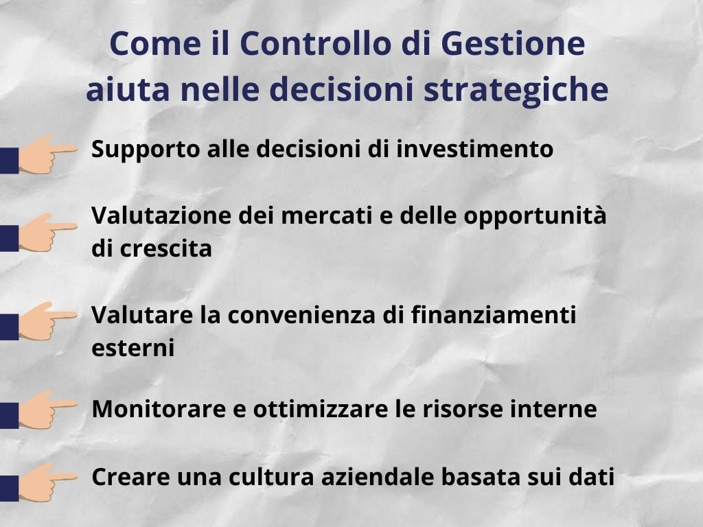 Una delle funzioni più potenti del Controllo di Gestione è la sua capacità di supportare il processo decisionale strategico. Le start-up, più di ogni altra impresa, devono affrontare decisioni cruciali in tempi rapidi: dall'allocazione delle risorse alla scelta dei mercati da esplorare, fino alla valutazione di nuovi investimenti. Senza strumenti adeguati di controllo, queste decisioni rischiano di essere prese basandosi esclusivamente su intuizioni o dati parziali, compromettendo la crescita dell'azienda. Il Controllo di Gestione, invece, offre dati concreti e un quadro chiaro che permette all’imprenditore di prendere decisioni più consapevoli e informate.