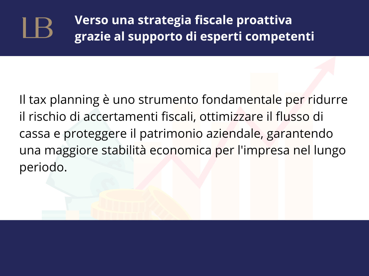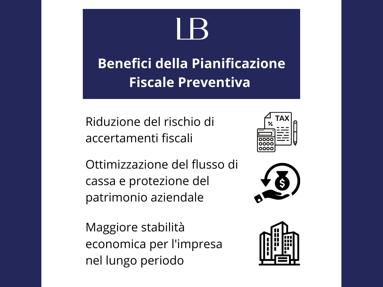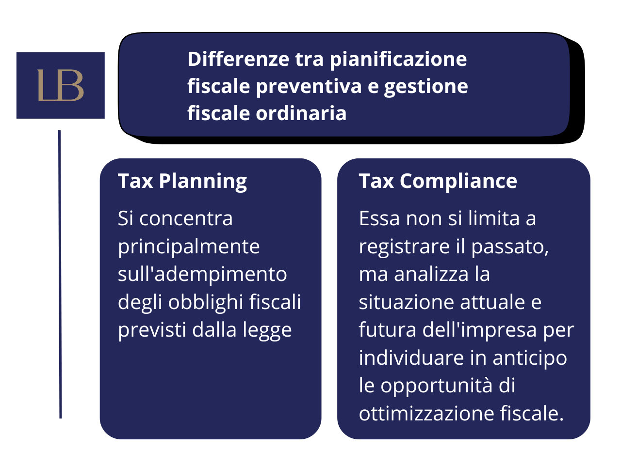 Molti imprenditori non dispongono di una strategia fiscale o di un'adeguata pianificazione finanziaria e credono erroneamente che solo le grandi aziende possano permettersi tali interventi. In realtà, esistono diversi modi per alleggerire la pressione fiscale attraverso pianificazioni appropriate, e Lex e Business Advisory offre consulenza specializzata proprio in questo ambito, distinguendosi dal lavoro del commercialista focalizzato sulla contabilità e l'amministrazione del già avvenuto. Pertanto, per una vera ottimizzazione fiscale, è consigliabile affiancare all'indispensabile attività del commercialista un'azione proattiva di pianificazione fiscale strategica fornita da consulenti specializzati.