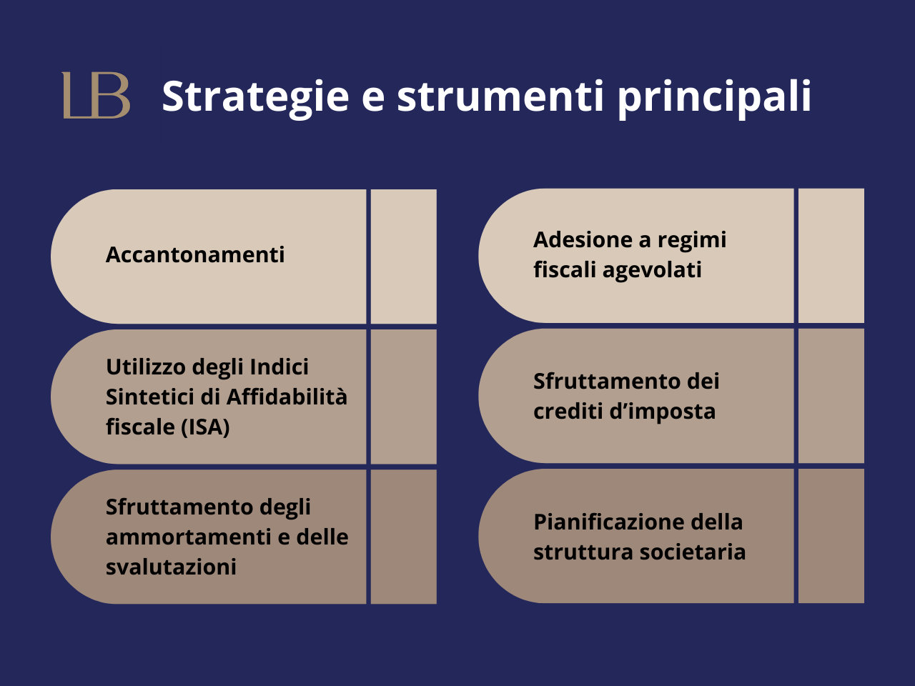 Una volta poste le basi della gestione aziendale attraverso un adeguato controllo di gestione e delle solide politiche di accontamento, si potrà procedere verso la riduzione del carico fiscale, realizzabile attraverso diverse strategie e strumenti, tra cui: